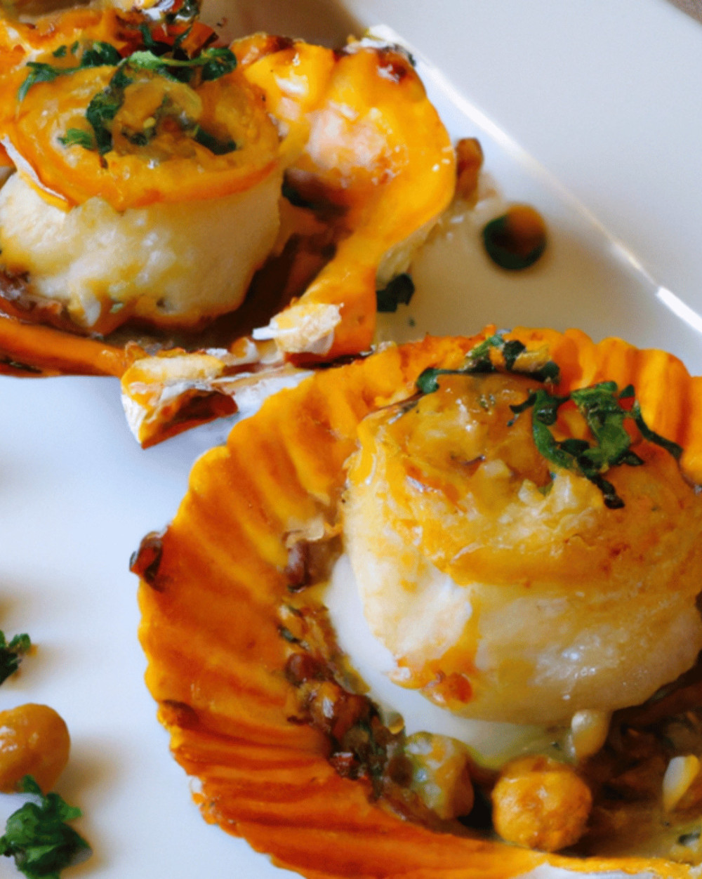 La délicatesse de Saint-Jacques en croûte est une entrée raffinée qui sublime la saveur douce et iodée des noix de Saint-Jacques. Enveloppées dans une pâte feuilletée dorée et croustillante, ces noix sont accompagnées d’une farce onctueuse et subtilement parfumée, offrant une expérience gastronomique exceptionnelle.