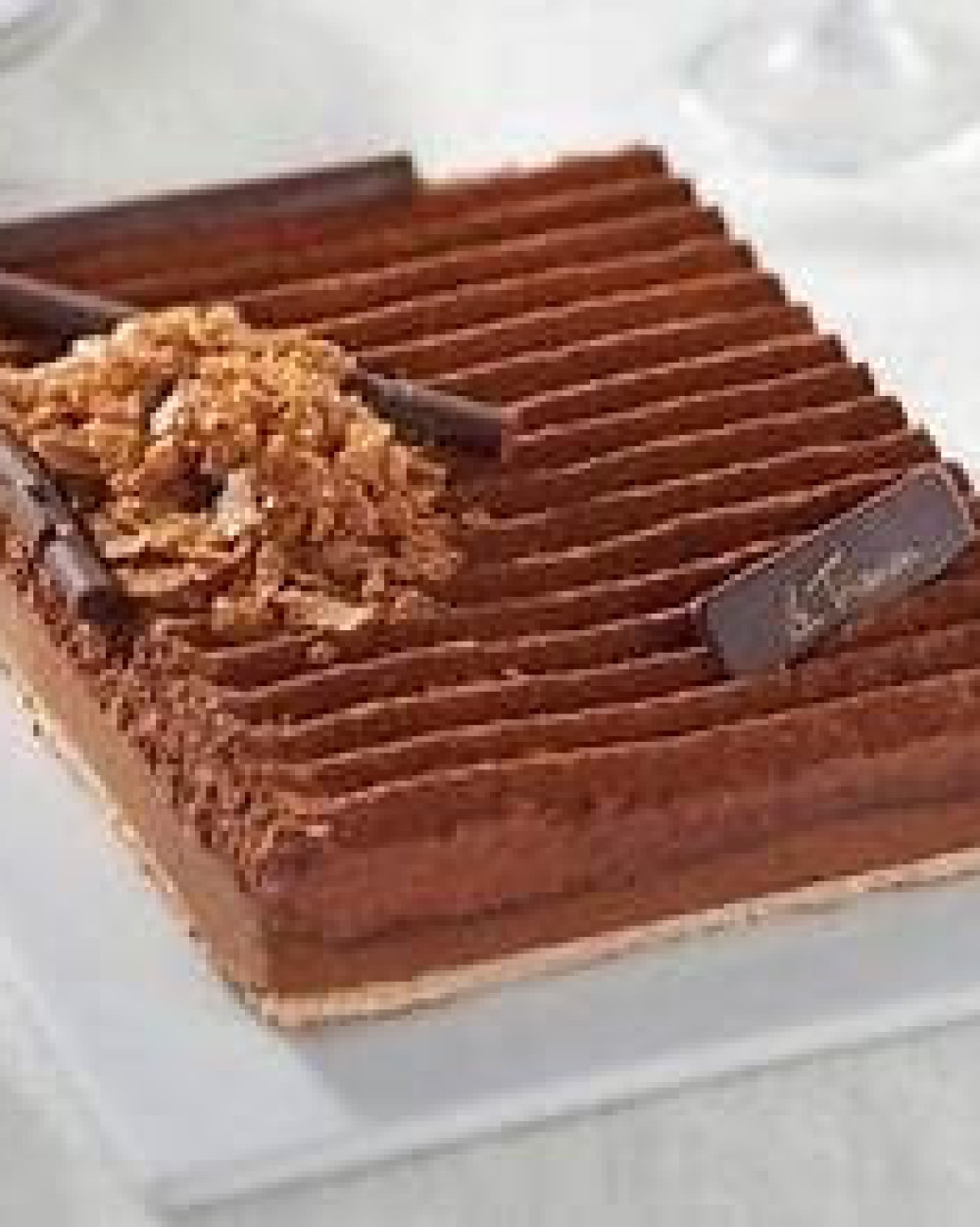 Le Trianon 6 parts est un dessert pâtissier raffiné composé de plusieurs couches gourmandes : un croustillant praliné, une dacquoise aux amandes et une mousse au chocolat légère et onctueuse.